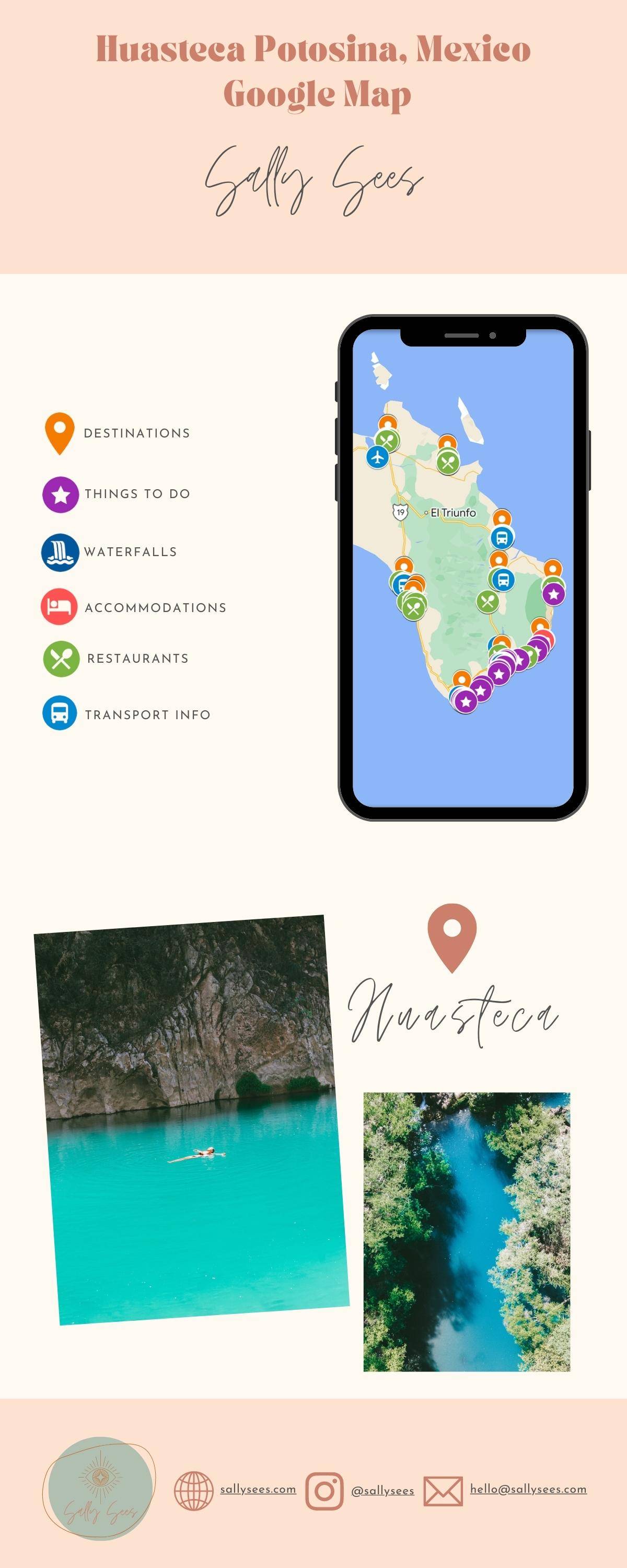 This Huasteca Potosina Google Map includes over 50 locations pinned across the region, broken down into handy categories: